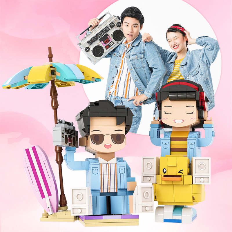 七夕節驚喜禮物 夏日海灘雙人積木公仔 定制雙人積木公仔 情侶定制積木擺件